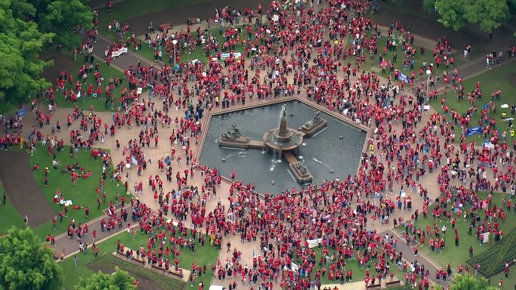 On a cool Might morning two weeks earlier, a sea of offended public college lecturers in purple T-shirts builds in Hyde Park, Sydney.